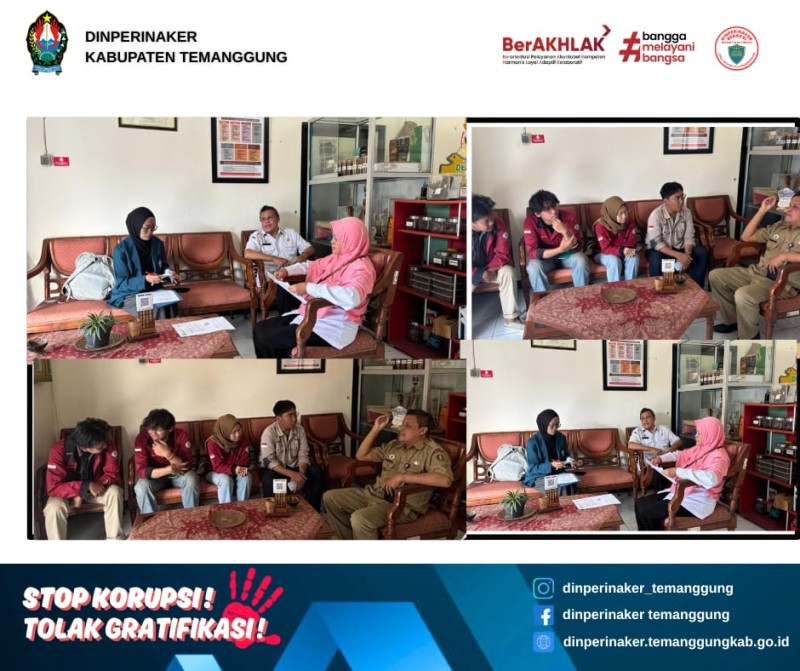 Kategori Smart Society (Masyarakat Cerdas) Kategori: Smart Society (Masyarakat Cerdas) Bidang Penempatan dan Pelatihan Kerja 24 April 2026 14:02:00 0 Dinas Perindustrian dan Tenaga Kerja Kabupaten Temanggung memberikan penyuluhan ketenagakerjaan kepada siswa/siswi kelas XII di SMK Negeri Tembarak Selengkapnya Kategori: Smart Society (Masyarakat Cerdas) Bidang Penempatan dan Pelatihan Kerja 24 April 2026 14:02:00 0 Dinas Perindustrian dan Tenaga Kerja Kabupaten Temanggung memberikan penyuluhan ketenagakerjaan kepada siswa/siswi kelas XII di SMK Negeri Tembarak Selengkapnya Kategori: Smart Society (Masyarakat Cerdas) Bidang Perindustrian 22 April 2026 14:01:00 0 Verifikasi standar kegiatan usaha industri pada CV Baz Group oleh tim verifikator dari Dinas Perindustrian dan Tenaga Kerja Kabupaten Temanggung Selengkapnya Kategori: Smart Society (Masyarakat Cerdas) Bidang Penempatan dan Pelatihan Kerja 20 April 2026 13:57:00 0 Dinas Perindustrian dan Tenaga Kerja Kabupaten Temanggung melaksanakan koordinasi bersama petugas KP2MI (Kementerian Pelindungan Pekerja Migran Indonesia) Provinsi Jawa Tengah ke Dinas Pendidikan Kabupaten Temanggung Selengkapnya Kategori: Smart Society (Masyarakat Cerdas) Bidang Perindustrian 15 April 2026 13:51:00 0 Diskusi produktif bersama mahasiswa Universitas Diponegoro Semarang dalam rangka pengumpulan dan analisis data untuk penyusunan tugas akhir Selengkapnya Kategori: Smart Society (Masyarakat Cerdas) Bidang Penempatan dan Pelatihan Kerja 09 April 2026 13:50:00 1 Rekrutmen PT Matahari Tire Indonesia Kendal yang diselenggarakan di Dinas Perindustrian dan Tenaga Kerja Kabupaten Temanggung Selengkapnya Kategori: Smart Society (Masyarakat Cerdas) Bidang Perindustrian 08 April 2026 15:51:00 1 Pendampingan IKM PR Mulyadi Terkait Permasalahan Akun SIINas dan Pelaporan Data Industri Selengkapnya Kategori: Smart Society (Masyarakat Cerdas) Sekretariat 08 April 2026 13:46:00 0 Sapaan Ketenagakerjaan Tingkat Desa (Sakti Desa) kembali dilaksanakan di Desa Gandu Kec. Tembarak Selengkapnya Kategori: Smart Society (Masyarakat Cerdas) Bidang Hubungan Industrial dan Syarat Kerja 07 April 2026 15:48:00 0 Halal bi Halal LKS Tripartit Kabupaten Temanggung dengan tema "Mempererat Silaturahmi, Membangun Sinergi" Selengkapnya Kategori: Smart Society (Masyarakat Cerdas) UPTD 07 April 2026 15:42:00 0 Alumni Balai Latihan Kerja Temanggung Sukses bekerja ke Jepang! Selengkapnya Kategori: Smart Society (Masyarakat Cerdas) Bidang Penempatan dan Pelatihan Kerja 07 April 2026 15:37:00 0 Seleksi PT Permodalan Nasional Madani (PNM Mekaar) di Aula Dinperinaker Temanggung Selengkapnya Kategori: Smart Society (Masyarakat Cerdas) Bidang Hubungan Industrial dan Syarat Kerja 06 April 2026 13:44:00 0 Bidang Hubungan Industrial dan Syarat-syarat Kerja Dinas Perindustrian dan Tenaga Kerja Kabupaten Temanggung Melayani Konsultasi PHK Selengkapnya 123NextLast